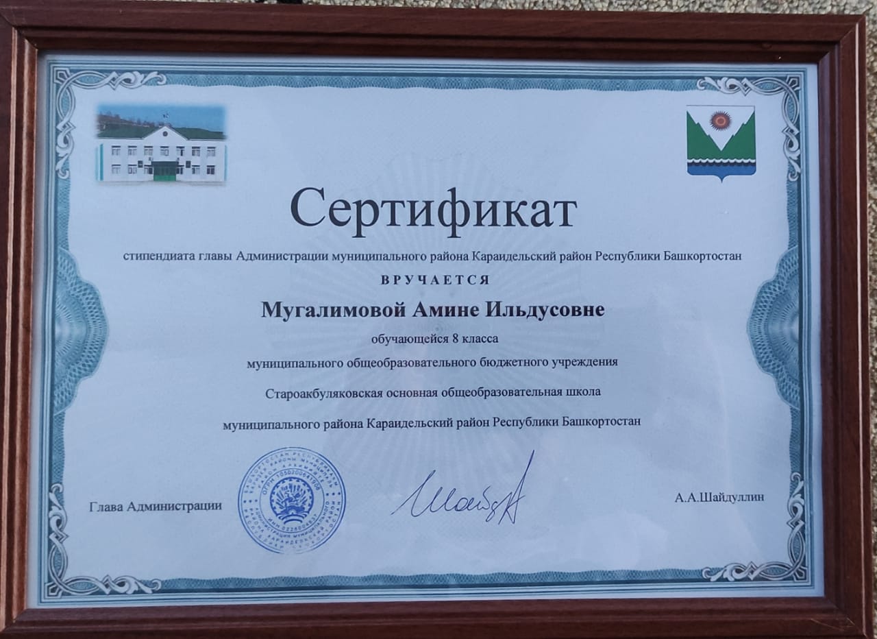 Ученица 8 класса МОБУ СТАРОАКБУЛЯКОВСКАЯ ООШ Мугалимова Амина стала стипендиаткой главы Администрации муниципального района Караидельский район Республики Башкортостан.