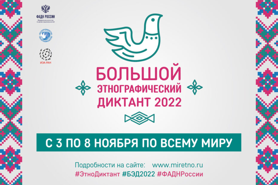Большой этнографический диктант пройдет 3-8 ноября 2022 года на площадках в России и за рубежом, написать диктант можно будет и онлайн. «Большой этнографический диктант 2022» - это Всероссийская, просветительская акция, которая позволит оценить уровень этнографической грамотности населения, их знания о народах, проживающих в Российской Федерации.